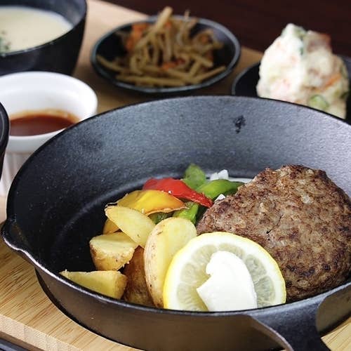 看板メニューの「熊本名産あか牛100%あらびきハンバーグ」をはじめ、肉の旨味あふれる「希少部位のミスジステーキ」は絶品。